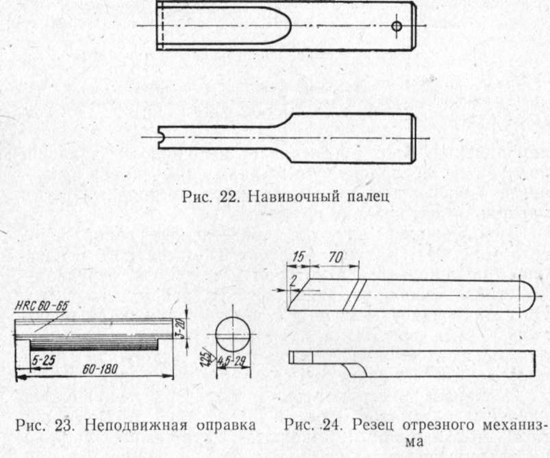 входные, средние и выходные направляющие планки механизма подачи (см. рис. 39), навивочный палец (рис. 22), неподвижная оправка навивочного механизма (рис. 23), шаговая лапка с пальцем шагового механизма (см. рис. 45) и отрезной резец отрезного механизма (рис. 24).