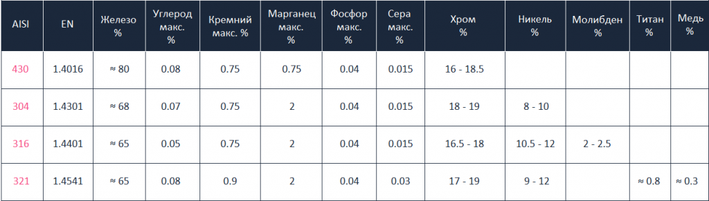 Рассматривая марки нержавеющей стали и их характеристики, выделим несколько наиболее распространенных металлов: