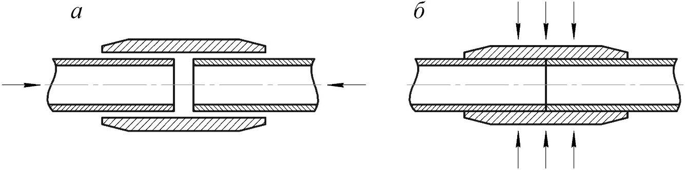 Рисунок 2 — Использование муфт с памятью формы: а – в состоянии сборки; б – конечное состояние; 1 – муфта; 2 – труба