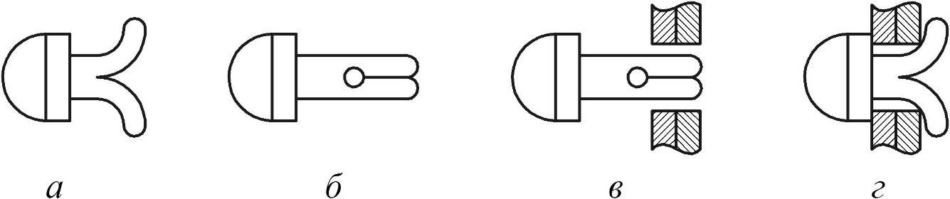 В особых случаях при соединении листовых (плоских) деталей, когда недопустимо использование заклёпок или болтов, могут быть применены штифты с памятью формы (рис. 3). Штифты в исходном состоянии имеют раскрытый торец (рис. 3 а). Перед операцией крепление штифта погружается в сухой лёд или жидкий азот. В результате охлаждения торец штифта выпрямляется, и его вводят в отверстие (рис. 3 б, в). При повышении температуры до комнатной происходит восстановление формы, торцы штифта разводятся (рис. 3 г), операция крепления завершается. Применение таких конструкций штифтов с памятью гарантирует герметичность и исключает возможность расстыковки соединений.