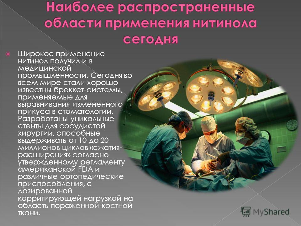 Широкое применение нитинол получил и в медицинской промышленности. Сегодня во всем мире стали хорошо известны бреккет-системы, применяемые для выравнивания измененного прикуса в стоматологии. Разработаны уникальные стенты для сосудистой хирургии, способные выдерживать от 10 до 20 миллионов циклов «сжатия- расширения» согласно утвержденному регламенту американской FDA и различные ортопедические приспособления, с дозированной корригирующей нагрузкой на область пораженной костной ткани.