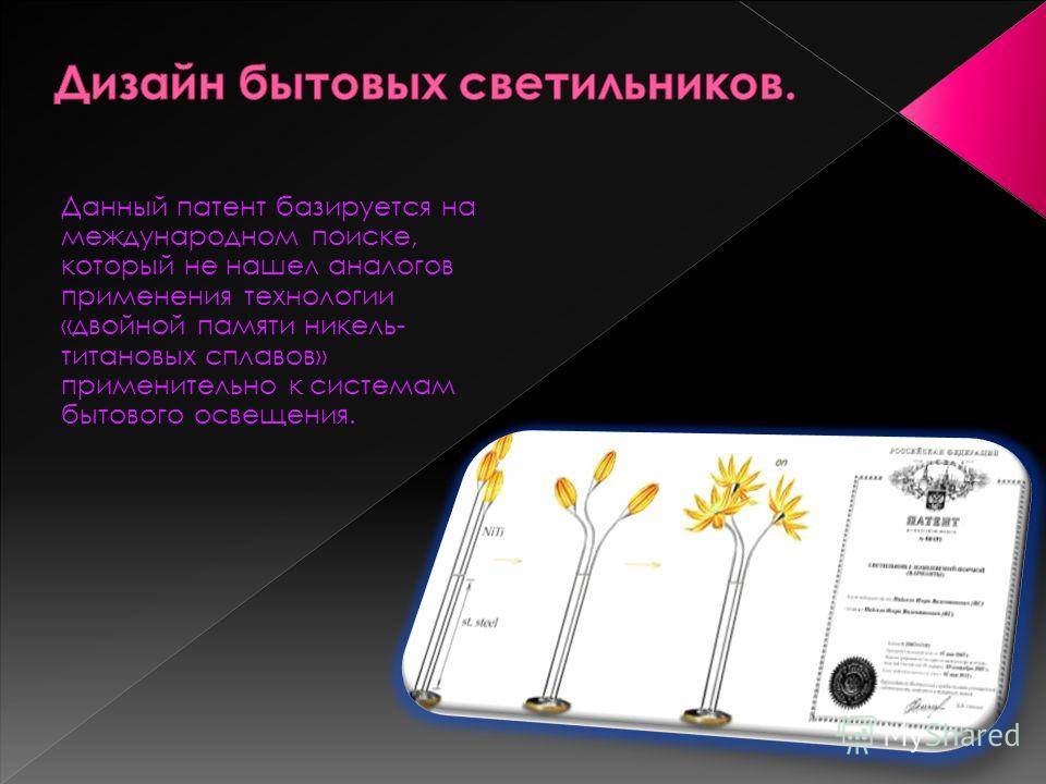 Данный патент базируется на международном поиске, который не нашел аналогов применения технологии «двойной памяти никель- титановых сплавов» применительно к системам бытового освещения.