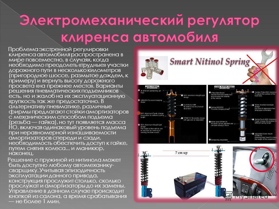 Проблема экстренной регулировки клиренса автомобиля распространена в мире повсеместно, в случаях, когда необходимо преодолеть «трудные» участки дорожного пути в несколько километров (пригородное шоссе, размытое дождем, к примеру) и вернуть высоту дорожного просвета «на прежнее место». Варианты решения пневматических подъемников есть, но и жалоб на их эксплуатационную хрупкость так же предостаточно. В альтернативу пневматике, различные фирмы предлагают стойки амортизаторов с механическим способом подъема (резьба гайка), но тут появляется масса НО, включая одинаковый уровень подъема при неравномерной изнашиваемости амортизаторов спереди и сзади, необходимость обеспечить доступ к гайке, путем снятия колеса… и маникюр, наконец. Решение с пружиной из нитинола может быть доступно любому автомеханику- сварщику. Учитывая эпизодичность эксплуатации данного привода, конструкция прослужит столько, сколько прослужат и амортизаторы до их замены. Управление в данном случае происходит кнопкой из салона, а время срабатывания не более 1 мин.