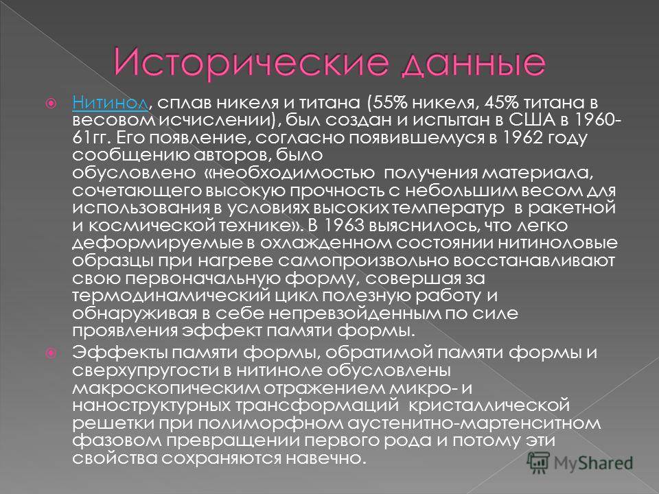 Нитинол, сплав никеля и титана (55% никеля, 45% титана в весовом исчислении), был создан и испытан в США в гг. Его появление, согласно появившемуся в 1962 году сообщению авторов, было обусловлено «необходимостью получения материала, сочетающего высокую прочность с небольшим весом для использования в условиях высоких температур в ракетной и космической технике». В 1963 выяснилось, что легко деформируемые в охлажденном состоянии нитиноловые образцы при нагреве самопроизвольно восстанавливают свою первоначальную форму, совершая за термодинамический цикл полезную работу и обнаруживая в себе непревзойденным по силе проявления эффект памяти формы. Нитинол Эффекты памяти формы, обратимой памяти формы и сверхупругости в нитиноле обусловлены макроскопическим отражением микро- и наноструктурных трансформаций кристаллической решетки при полиморфном аустенитно-мартенситном фазовом превращении первого рода и потому эти свойства сохраняются навечно.