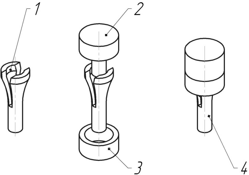Рисунок 4 — Схема сборки электрического соединителя с памятью формы: 1 – втулка; 2 – штекер; 3 – обжимное кольцо с памятью формы; 4 – соединение в сборе