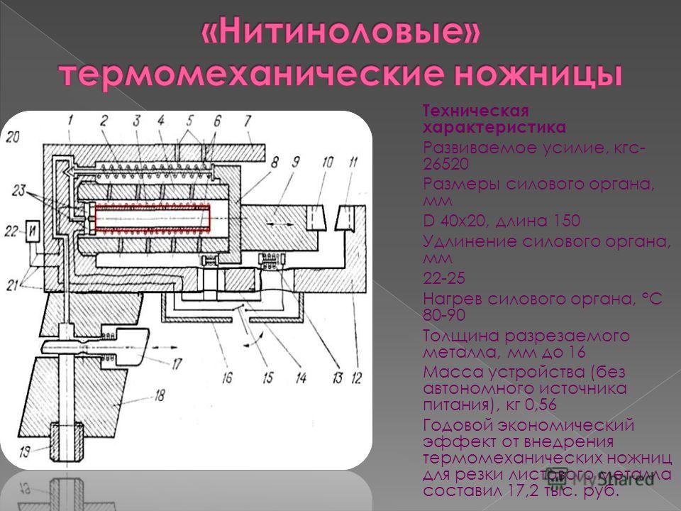 Техническая характеристика Развиваемое усилие, кгс Размеры силового органа, мм D 40×20, длина 150 Удлинение силового органа, мм Нагрев силового органа, °С Толщина разрезаемого металла, мм до 16 Масса устройства (без автономного источника питания), кг 0,56 Годовой экономический эффект от внедрения термомеханических ножниц для резки листового металла составил 17,2 тыс. руб.