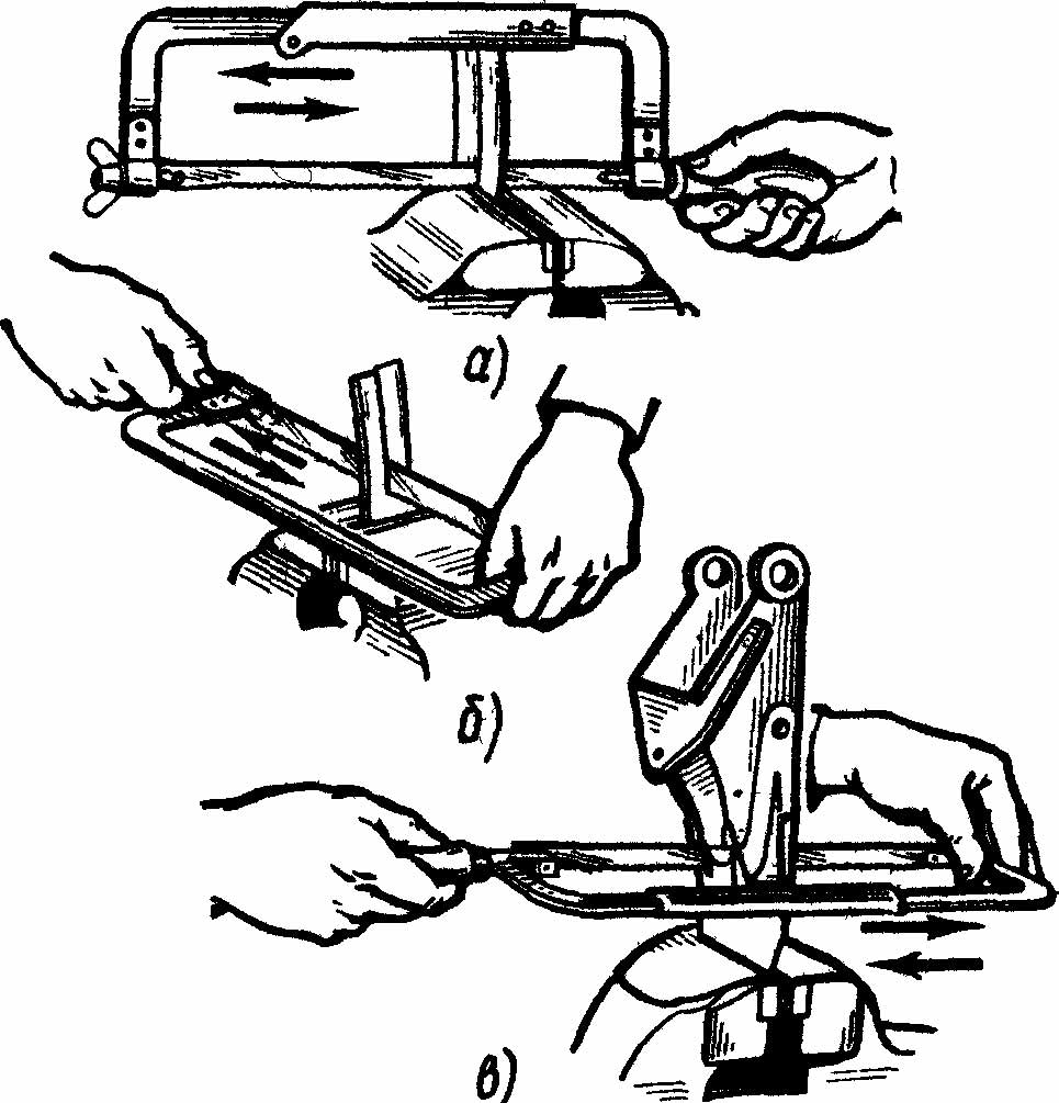 Ножовкой с полотном, повернутым на угол 90°, производят резку в том случае, когда глубина прореза превышает расстояние от полотна до рамки ножовочного станка (рис. а), т. е. при глубоких прорезах.