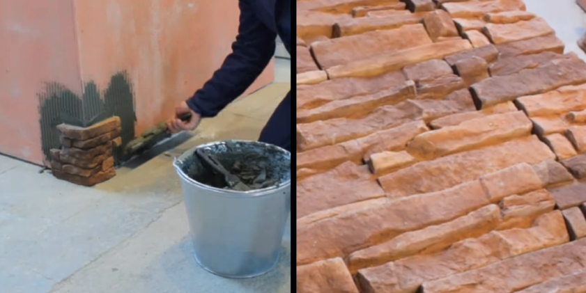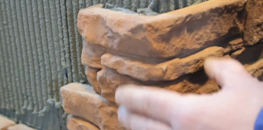 Для приклеивания искусственного декоративного камня используют те же клеевые смеси, что и для натурального. Кладка этих облицовочных материалов мало чем отличается от кладки кафельной плитки. Бесшовный метод более быстрый и легкий, так как исключены этапы заполнения и расшивки зазоров.