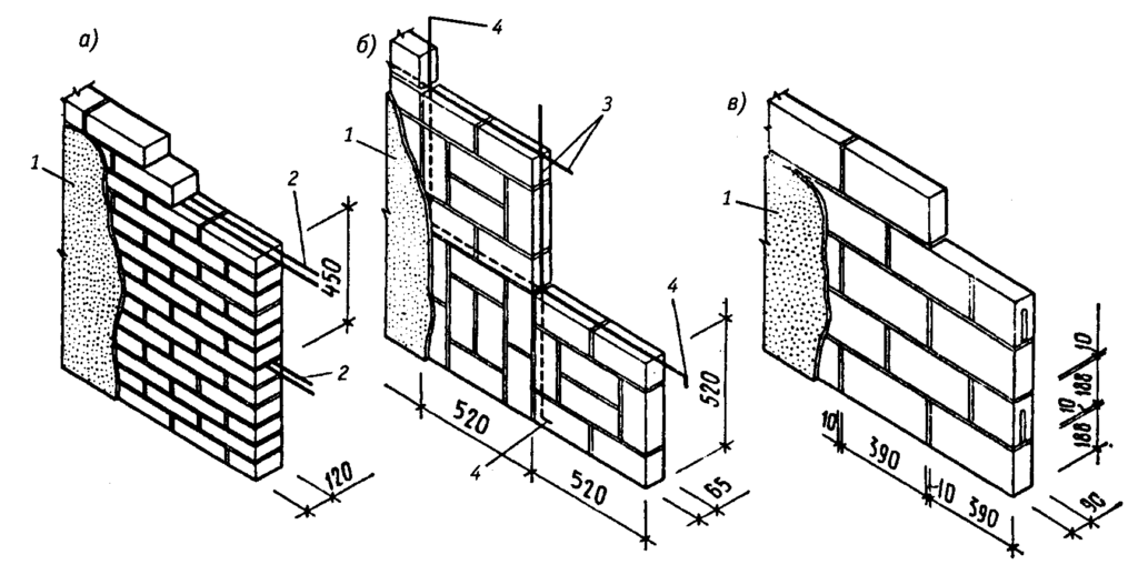 | Со стенами | Перед началом монтажа в стены, стыкующиеся с перегородкой, вбивают металлические штыри или вставляют в заранее просверленные отверстия (5 см) арматурные прутки. В блоках выпиливают отверстия для насаживания на эти штыри либо располагают арматуру так, чтобы блочные элементы укладывались на выступающие концы. | Каждые 2–3 ряда. |