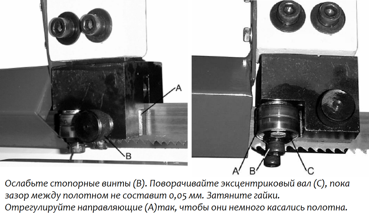- Ослабьте винты фиксации твердосплавных направляющих, отодвиньте их от полотна. Затем медленно поворачивайте шестигранным ключом эксцентриковый вал до тех пор, пока зазор не будет равняться 0,05 мм. Параметр проверяется специальным металлически м щупом. Все в норме – сильно затяните гайки.