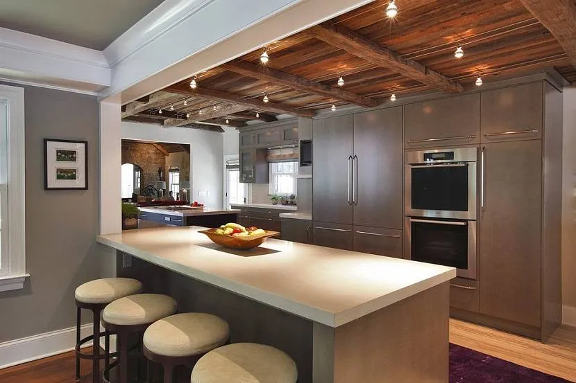 Некоторые люди предпочитают оформить потолок рейками-ламелями. Для разного дизайна выбираются белые, бежевые или металлические цвета. Реечные панели могут быть выполнены из пластика или алюминия. Последний вариант хотя и дороже, но больше подходит для кухонного помещения. Также предпочтительнее система обустройства со скрытыми швами — во избежание скопления жира и гари, чтобы поверхность можно было помыть без затруднений. Способ монтажа аналогичен конструктору, его вполне можно выполнить самостоятельно.