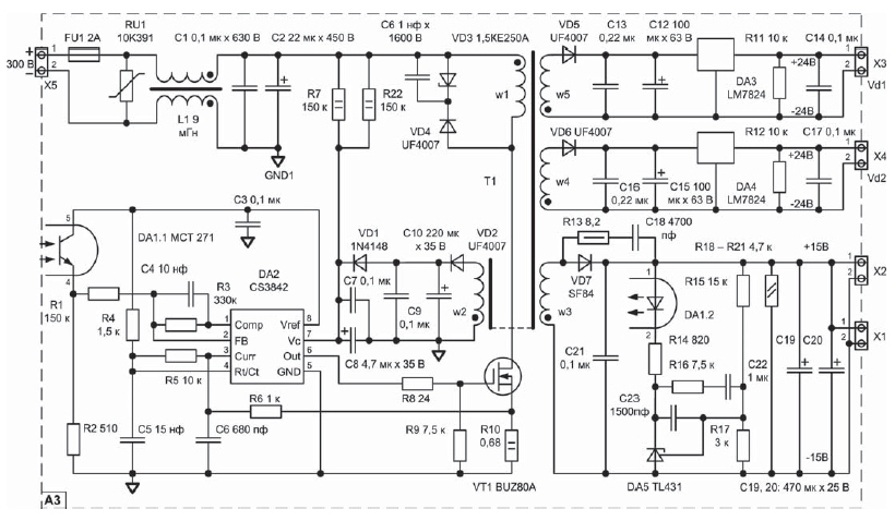 Напряжения, необходимые для питания ШИМ-контроллера, драйверов IGBT и блока БТК, получаются с помощью маломощного блока питания (БП) А3, показанного на рис. 6. Блок А3 представляет собой обратноходовой преобразователь с управляющей микросхемой CS3842. Микросхема DA2 используется в типовом включении с внутренней ООС по току ключа VT1. ООС по напряжению также организована традиционным способом с помощью DA1 и DA5: стабилизируется напряжение канала +15 В как самого нагруженного. БП имеет три гальванически развязанных выхода: +15 В/1,5 А и два канала по +24 В/0,1 А. Трансформатор Т1 выполнен на сердечнике EPCOS ETD29/16/10 В66358 N27, который собран с зазором между боковыми кернами 0,08 мм. Индуктивность намагничивания первичной обмотки равна 1400 мкГн, индуктивность рассеивания наиболее нагруженной обмотки w3, приведенная к первичной обмотке w1, составляет 30 мкГн. Рабочая частота преобразователя 60 кГц. Блок питания запускается при напряжении на входе (соединитель Х5) +150 В и сохраняет свои параметры до величины выпрямленного сетевого напряжения +70 В.