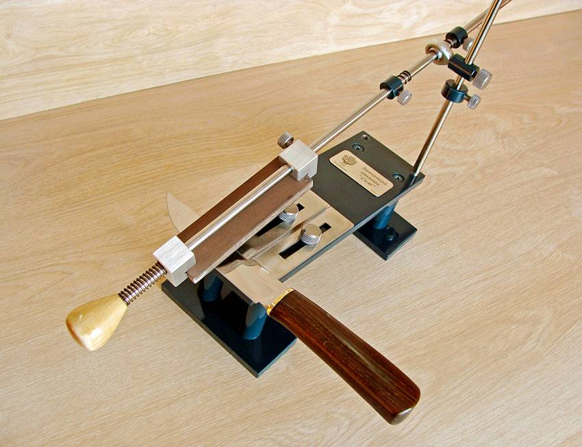 На горизонтальном основании фиксируется нож, а его закрепление обеспечивает магнит. Наждачный элемент располагается на стержне, вдоль которого может перемещаться перпендикулярно ножу. Направляющий стержень устанавливается в отверстиях вертикальной стойки.