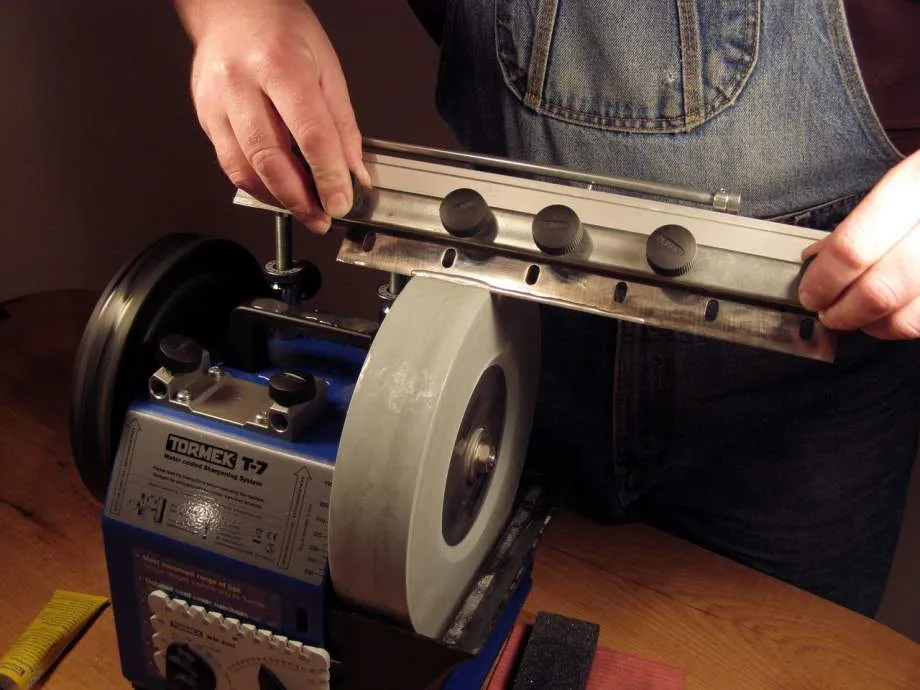 Ножи для электрорубанков сразу зажимаются в устройстве для заточки, поскольку правильно удержать их в руках очень сложно. Работа производится на мелкозернистом абразиве с применением водяной ванны.