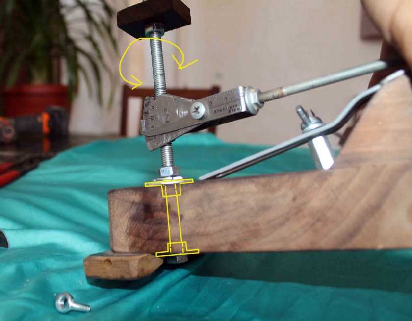 Металлическую шпильку с шариком из пластмассы необходимо вставить в сквозное отверстие, которое сделали на металлической заготовки. При помощи барашковой гайки крепим железный болт в неподвижном состоянии. Благодаря металлической планке удается зафиксировать точильный камень под определённым углом.