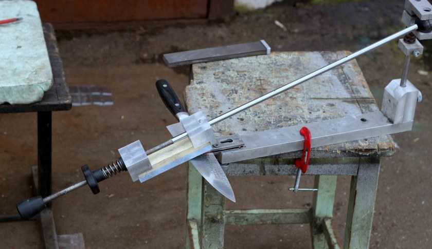 Устройство представляет собой опорный стол, на котором закрепляется нож. На противоположном конце стола вертикально закреплена винтовая стойка с планкой. В эту планку вставляется направляющий стержень, на котором монтируется абразивный брусок. Методом передвижения планки по винтовому стержню можно изменить величину угла обработки металла.