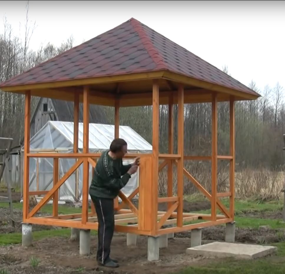 Если вы добрались до этой части работ, то можете потихоньку начинать праздновать, большая часть работы позади. Благодаря удобной конструкции беседки всё, что вам нужно, это нарезать одинаковые по размерам доски и прибить их к нижней обвязке и перилам.