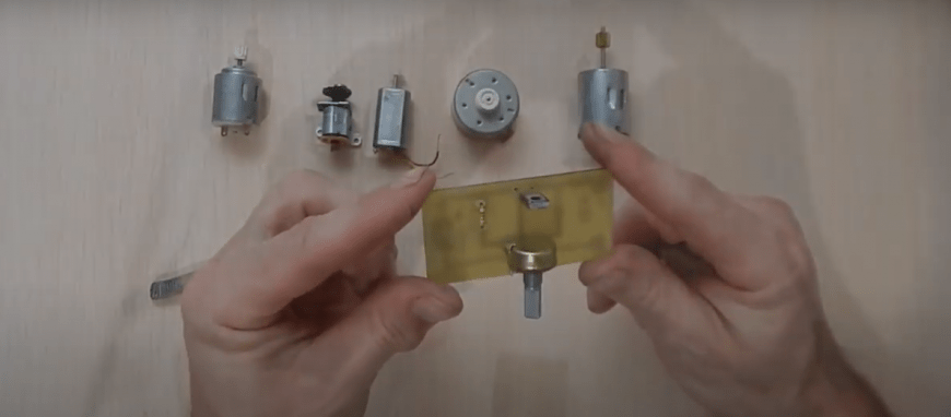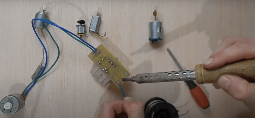 Здесь две, не связанные между собой обмотки статора, через выключатель, имеющий в конструкции работающую от руки кнопку пуска, соединены с источником напряжения (бытовая сеть). Дальше каждая из обмоток с помощью специальных контактов соединяется с графитовыми щетками, которые с помощью пружин прижимаются к поверхности коллектора. В свою очередь концы обмоток ротора подключаются к ламелям коллектора, образуя замкнутую электрическую цепь.