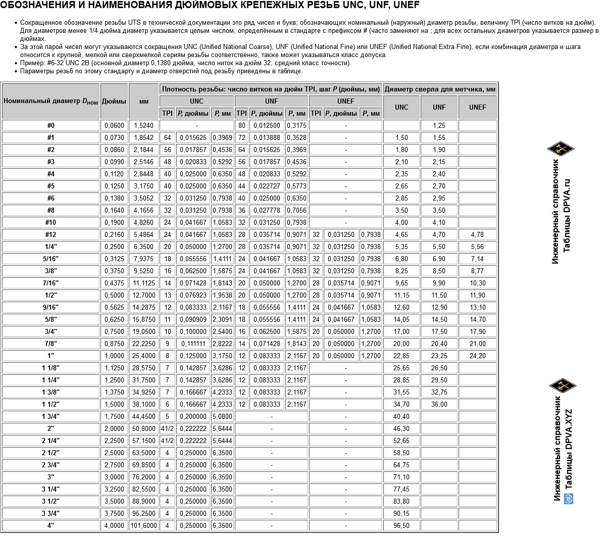 ОБОЗНАЧЕНИЯ И НАИМЕНОВАНИЯ ДЮЙМОВЫХ КРЕПЕЖНЫХ РЕЗЬБ UNC, UNF, UNEF
