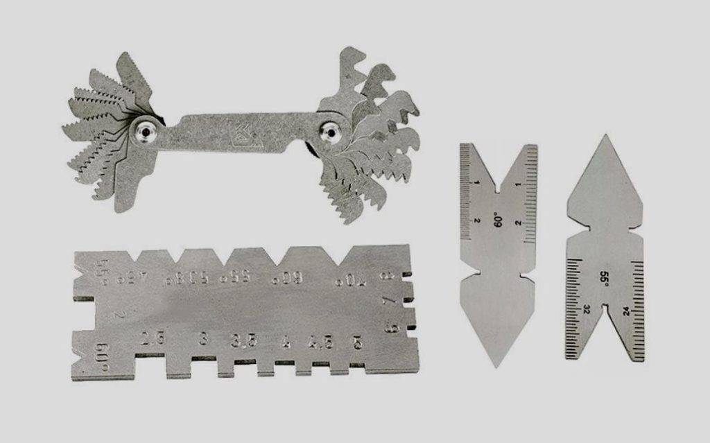 Такое название носит специальный инструмент, состоящий из специальных пластин (гребенок), на одной из сторон которой располагаются выступы, помогающие определить шаг резьбы. Пластины закреплены на одной или двух осях, объединенных в общем корпусе. Существуют отдельные шаблоны для метрической и дюймовой резьбы. Легко отличить их друг от друга помогает маркировка: на первых стоит знак 60°, на вторых — 55°.