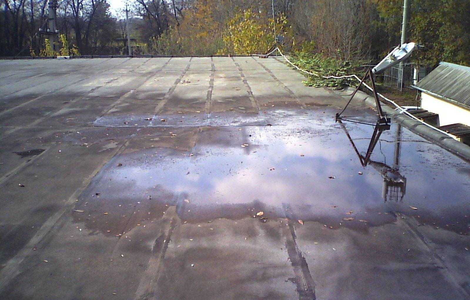 Для исключения возможного скопления воды на поверхности крыши следует залить ее водой, отметить мелом участки, где вода не стекла. Согнать воду и подсушить крышу, после чего отмеченные места залить горячей мастикой или уложить дополнительный слой рубероида толщиной не более 1 мм. Заключительным этапом станет укладка верхнего слоя кровли с последующим нанесением на него специального состава, нейтрализующего негативное воздействие внешней среды.