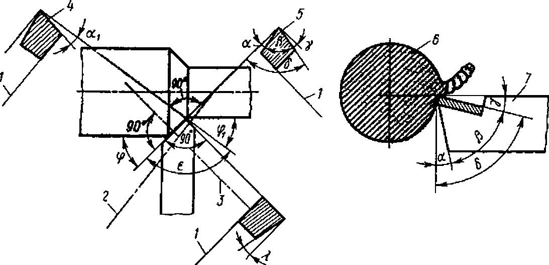 Рис. 3. Геометрия резца: 1 — основная плоскость, 2 — вспомогательная секущая плоскость, 3 — главная секущая плоскость, 4 — сечение по вспомогательной секущей плоскости, 5 — сечение по главной секущей плоскости, 6 — заготовка, 7 — резец.