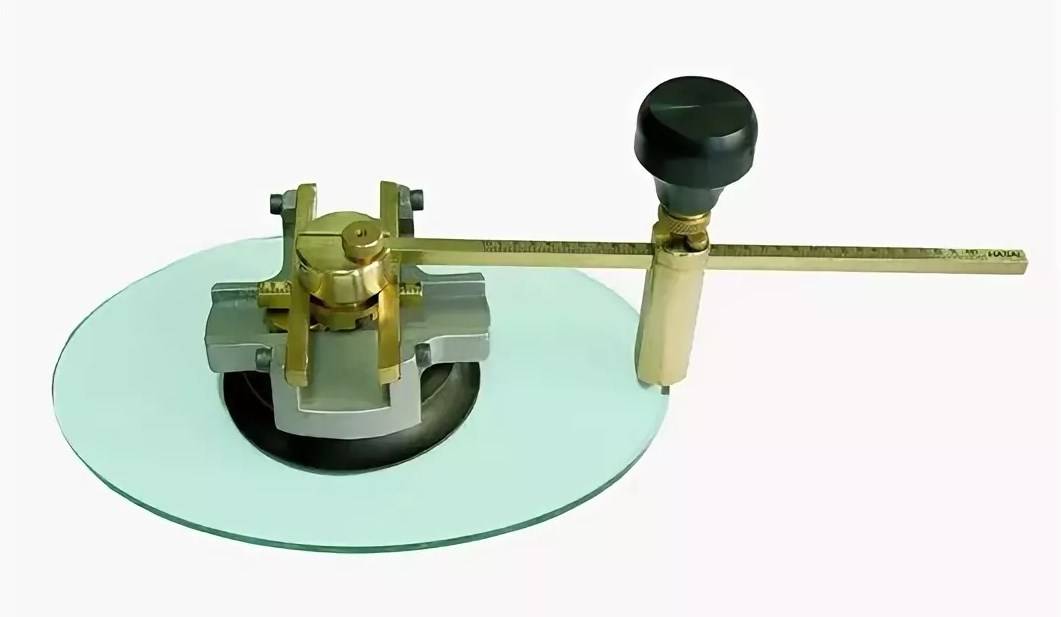 Тогда, когда обычный стеклорез справиться с задачей не может, прибегают к помощи специального приспособления – циркульного стеклореза, способного вырезать круг или овал. В его конструкцию входит присоска для стекла, шкала регулировки радиуса и сам стеклорез. Для овалов применяют сразу несколько штанг одновременно.