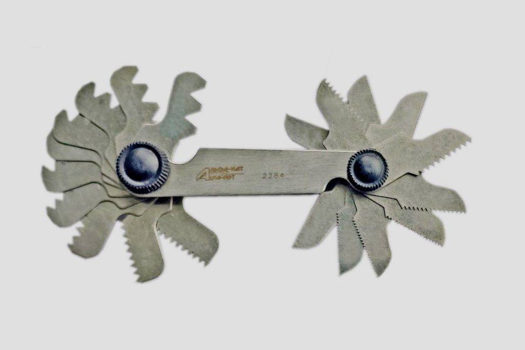 В специализированных магазинах можно приобрести резьбомер. Количество измерительных пластин у этого устройства может быть различным. Чем больше, тем удобнее использовать резьбомер.