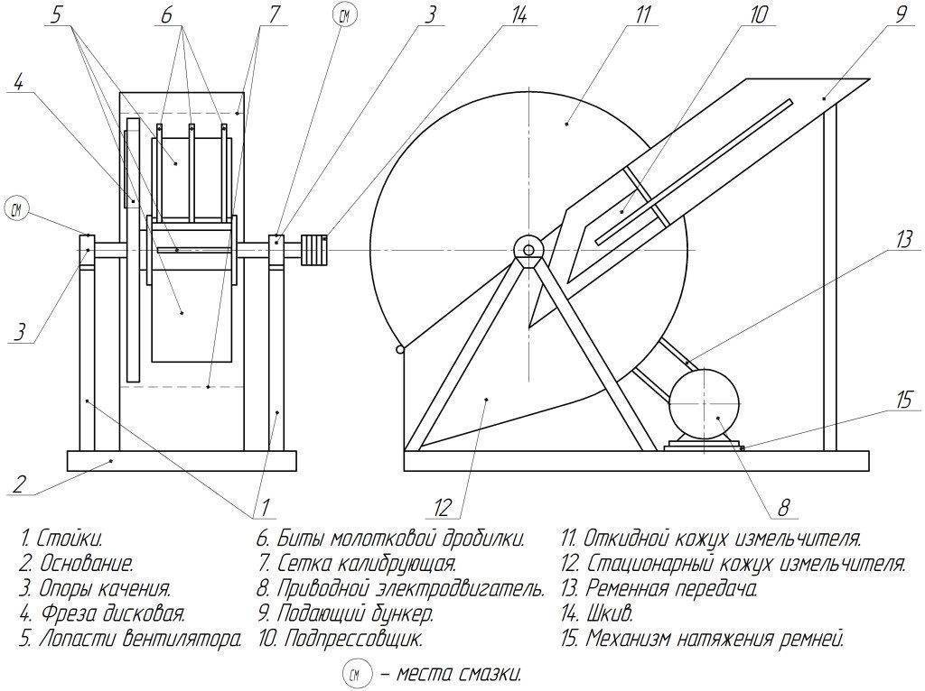 Необходимые чертежи, по которым для производства арболита может быть изготовлена самодельная роторно-молотковая дробилка, представлены ниже. Так как оборудование самодельное, то и размеры деталей придется подбирать, исходя из собственного материала. Рабочие чертежи разных щепорезов могут отличаться размерами и наличием тех или иных узлов, но принцип работы остается одинаковым. После подачи на оборудование напряжения В электродвигатель предает свое вращение при помощи клиноременной передачи на барабан с лезвиями 4 через шкив 14 и вал.