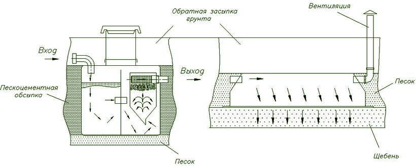 При нормальных дренирующих характеристиках грунтов монтаж инфильтратора осуществляется на щебеночную отсыпку толщиной от 40 см, при не дренирующих грунтах (суглинок, глина) толщина подушки назначается большей. Боковые стенки укрываются геотекстилем. Щебень играет роль фильтра — на нем оседают остатки загрязнителей, освобожденная от примесей вода уходит в почву. Инфильтратор, как и септик, подлежит теплоизоляции и засыпанию песком. На выходе из устройства монтируется стояк вентиляции.