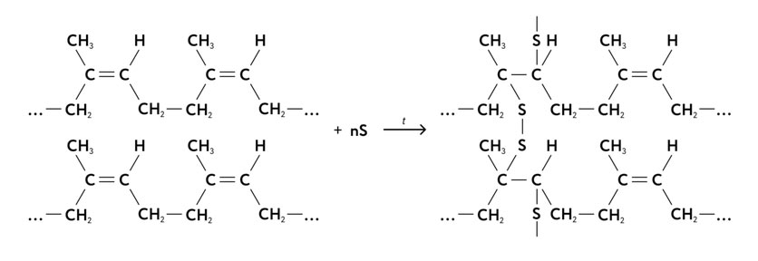 Самое массовое использование природного каучука на практике — это изготовление резины. В основе этого процесса лежит реакция вулканизации, разработанная еще в XIX веке.