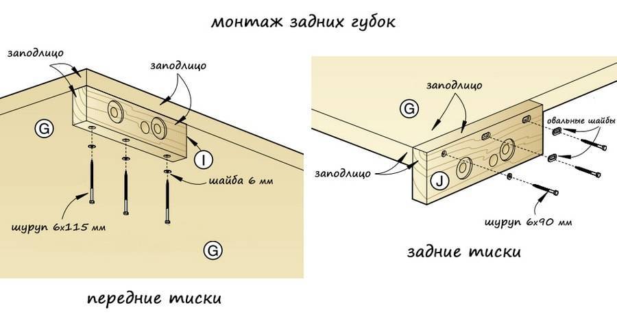 Задние губки передних и задних тисков монтируют к крышке верстака как показано на фото.