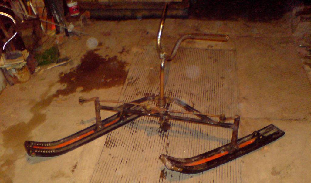 - Рулевое управление. Подойдёт руль от скутера или велосипеда. Главное, правильная установка – центральной осью должна производиться регулировка тягового усилия для возможности управлять лыжами и, соответственно, легко передвигаться;