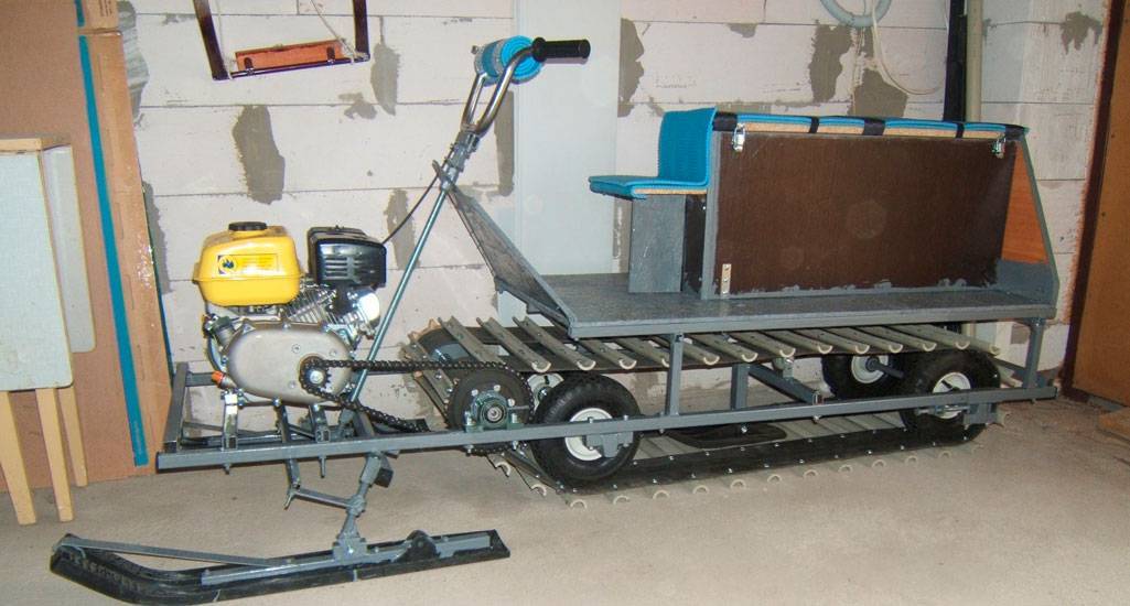 - Последний этап изготовления – монтаж навесных приспособлений. Самодельный снегоход потребуется укомплектовать мягким сиденьем, а также установить в его передней части рукоятку с ручкой газа и рычагом тормоза.