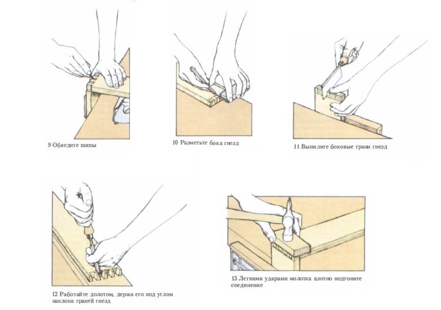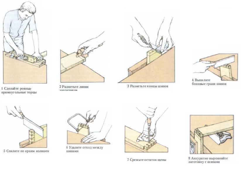 Колючки и хвосты должны идеально подходить друг к другу. При правильном подключении для сборки достаточно легкого метчика с молотком. Если соединение слишком тугое, детали разбираются, определяется проблемное утолщение и очень аккуратно обрабатывается стамеской.