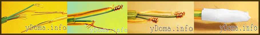 Освобождается от изоляции проводники мишура 10-15 мм и проводники, с которыми требуется соединить мишуру на длину 20-25 мм со сдвигом с помощью ножа способом, описанным в статье сайта «Подготовка проводов к монтажу». Нитка из мишуры не удаляется.