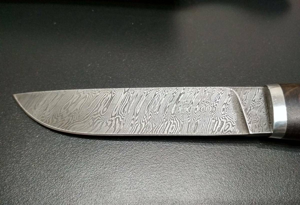 Узор на лезвии ножа характерен для дамасской стали из-за особого процесса подготовки стальной пластины.