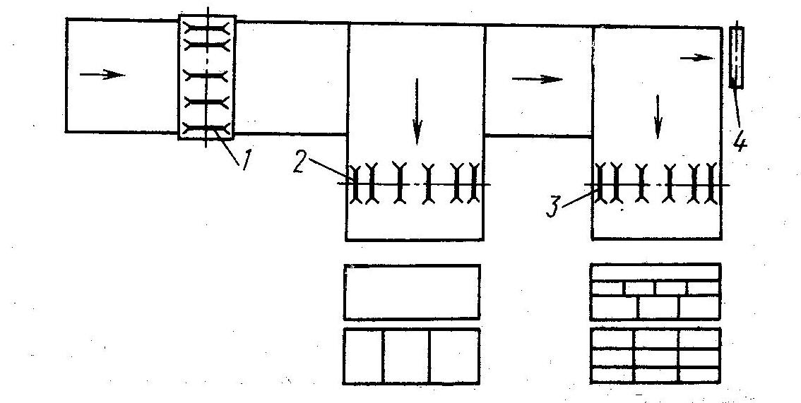 Проходные станки (рис. 5.5). Плита вначале раскраивается на продольных пилах 1. Полосы, не нуждающиеся в дальнейшей обработке, снимаются с машины на рольганг 4. Оставшиеся отрезы плиты поступают на две секции с пилами 2 и 3 для поперечного раскроя. Увеличенное до 5-6 число продольных и до 18-20 число поперечных пил создает оптимальные условия для реализации любого плана раскроя.