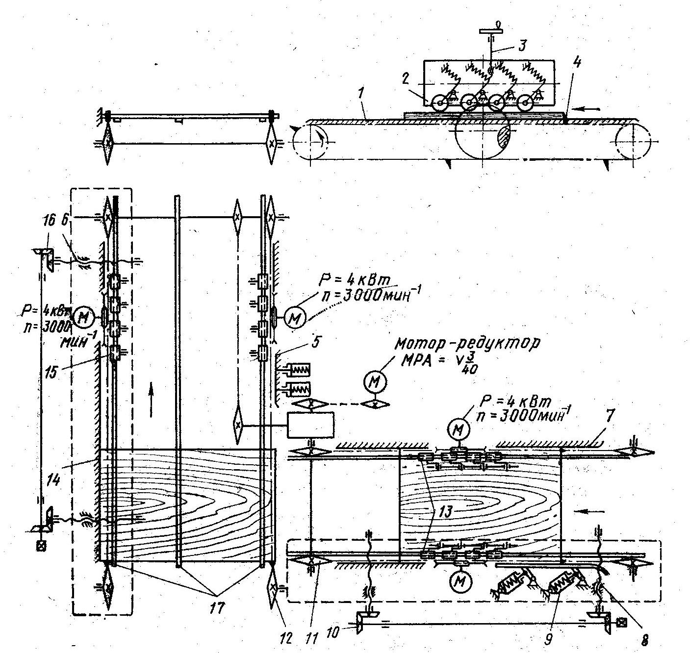 Оба конвейера работают от одного привода, что обеспечивает синхронность движений их упоров. При подходе к зоне резания заготовка, базированная по упорам на цепях, выравнивается на направляющих и прижимается к направляющим линейкам 7 и 14 подпружиненными балками 9 и 5. В зоне резания заготовка прижимается к направляющим гладким вальцам 13 и 15, смонтированным в блоки 2, которые, так же как и пильные суппорты, имеют вертикальное настроечное перемещение от винтов 3. Для обрезки заготовок различных размеров в обеих секциях станка все левые по направлению подачи элементы смонтированы на одном блоке, который с помощью 8 и 6 и зубчатых конических 10 и 16 пар может быть переставлен на нужную величину. К недостаткам станков этого типа можно отнести: возможность неперпендикулярного реза из-за перебазирования заготовки с одного конвейера на другой и погрешности в обработке из-за неравномерного вытягивания цепей.