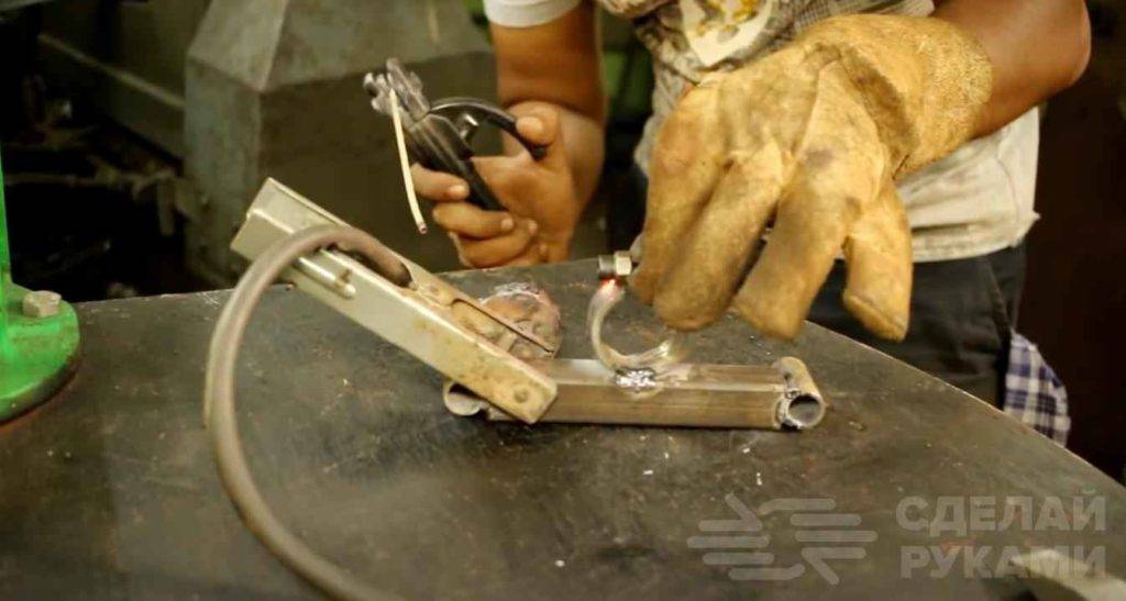Отрезаем кусок квадратного профиля, и вырезаем на концах седловины. Потом к нему привариваем две втулки.