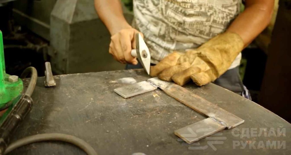 Далее отрезаем три куска стальной полосы, и свариваем из них основание стойки (опорную площадку).