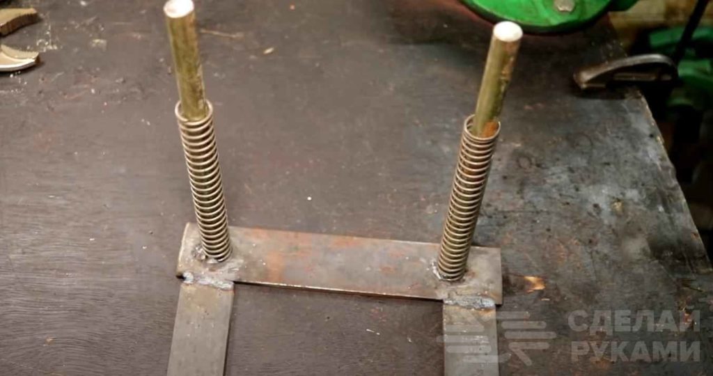 Привариваем к основанию направляющие из гладкой арматуры. Надеваем на них пружины.