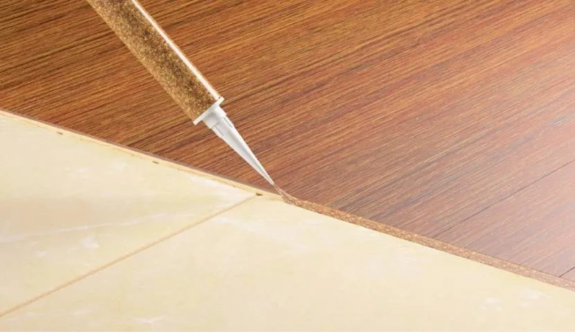 | На следующем этапе приступают к герметизации стыка между плиткой и ламинатом. Цвет герметика подбирают под оттенок ламината, плитки или фуги. Герметик наносят на шов. | |