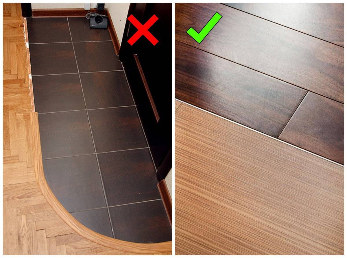 Стык между двумя материалами должен оставаться незаметным, нельзя, чтобы переход возвышался над полом. При ремонте необходимо учитывать такие правила: