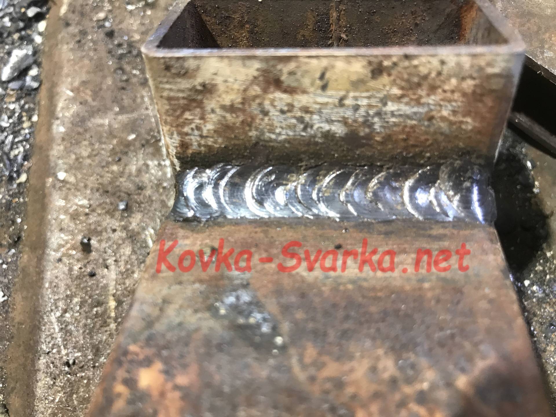 Начинаем варить с середины, постепенно продвигаясь к краям. При сваривании разнотолщинных профилей, зажигать дугу необходимо на более толстой трубе и переходить на более тонкую. Колебания можно совершать как круговые, так и зигзагообразные.