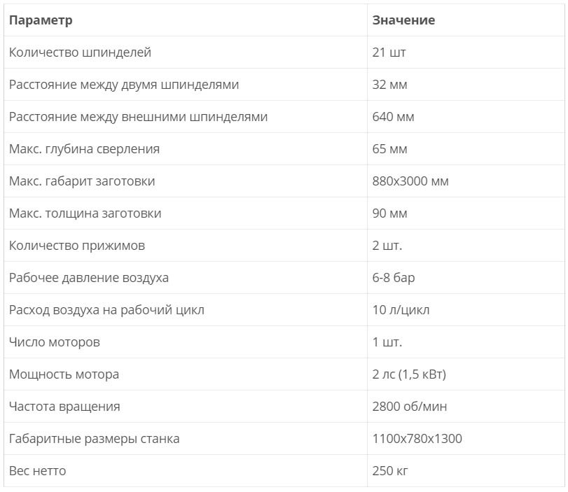 Головка состоит из шпинделей, установленных в ряд с одинаковыми промежутками — 3,2 см. Это стандарт для мебельного оборудования, которого придерживаются практически все производители.
