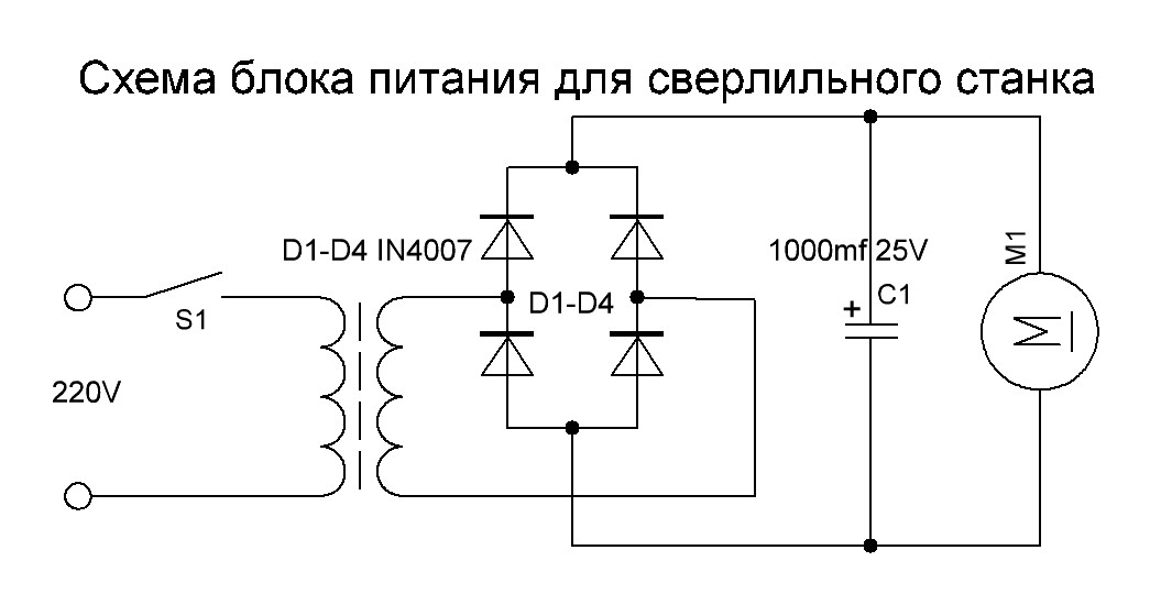 Схема блока питания для сверлильного станка состоит из четырех диодов IN4007 и одного конденсатора 1000mf 25V. Так, что проблем с радиодеталями быть не должно. Трансформатор любой маломощный на 12В 0.5А. Светодиодная подсветка подключается параллельно к контактам электродвигателя. В качестве источника света я использовал небольшую прямоугольную светодиодную панельку.