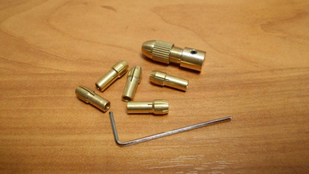 В комплекте с любым патроном прилагается пять цанговых переходников под разные сверла диаметр которых 0.5 мм, 1 мм, 1.5 мм, 2.5 мм, 3 мм.