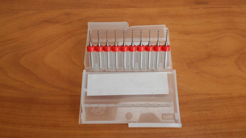 Для сверления отверстий в печатных платах лучше всего использовать специальные сверла из твердого сплава сделанные в Японии купленные в Китае на Алике. Диаметр хвостовика 3 мм, диаметр рабочей части сверла 0.9 мм. Как показала практика это самый универсальный размер отверстий подходит для большинства радиодеталей.