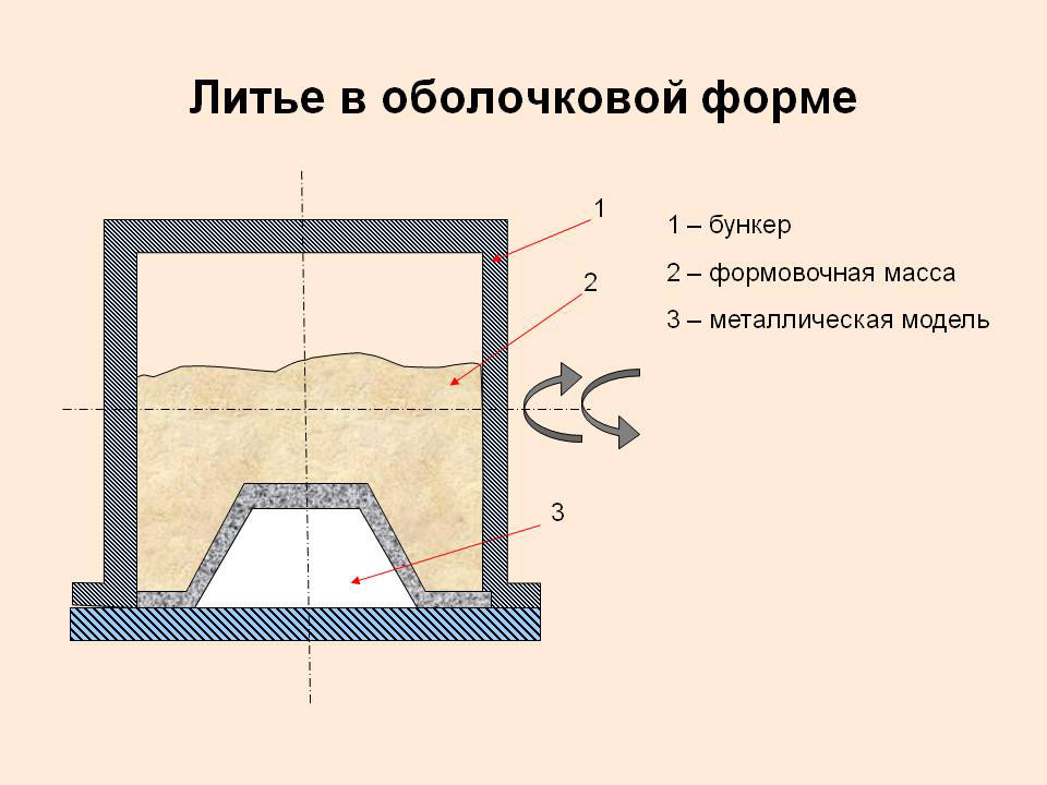 Вначале песок тщательно перемешивается со смолой, которая действует как связующее. Затем песок засыпается в нагретую форму, температура которой обычно достигает 750…13000С. Нагретая форма инициирует реакцию с песком, покрытым смолой. Когда песок вступает в контакт с горячей формой, на внутренней её поверхности образуется оболочка. Далее излишки песка удаляют из формы, а затем удаляется и сама оболочка, для чего используются выталкивающие штифты. Выталкиватель встроен в саму форму, что позволяет легко удалить вновь созданную оболочку, при этом не повредив её.